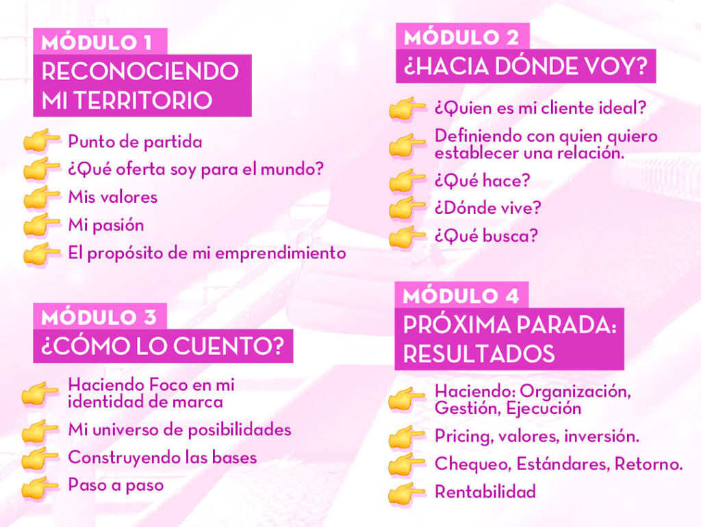 Es una capacitación de cuatro módulos que podés comenzar cuando desees y desde el lugar que más te guste. El desarrollo está basado en el coaching ontológico, así como también en comunicación, desarrollo de estrategia y marketing. Para que puedas gestionar el impulso de tu proyecto de manera completa, concreta y efectiva.